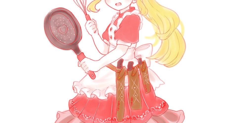 手に持っているものがフライパンと泡立て器という謎の組み合わせになっていますが、フライパンと泡立て器の形が好きだからという私事な理由です。